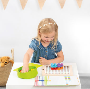 Le attività possibili sono tante: dalla riproduzione di pattern e immagini, al completamento di figure simmetriche, alla libera creazione di opere bidimensionali o tridimensionali, combinando le forme di legno alle palline.